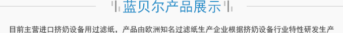 濟(jì)南藍(lán)貝爾工貿(mào)有限公司主要產(chǎn)品擠奶設(shè)備過濾紙,牛奶過濾紙,擠奶機(jī)過濾袋,目前主營進(jìn)口擠奶設(shè)備用過濾紙,產(chǎn)品由歐洲知名過濾紙生產(chǎn)企業(yè)根據(jù)擠奶設(shè)備行業(yè)特性研發(fā)生產(chǎn),產(chǎn)品符合歐盟食品接觸標(biāo)準(zhǔn)及FDA食品接觸標(biāo)準(zhǔn),產(chǎn)品在擠奶設(shè)備過濾紙行業(yè)占有70%以上的份額。并通過了SGS標(biāo)準(zhǔn)技術(shù)檢測中心按國標(biāo)食品級(jí)標(biāo)準(zhǔn)進(jìn)行的檢測。產(chǎn)品適用于各種擠奶設(shè)備品牌,本公司目前獲得該區(qū)域產(chǎn)品營銷資格。產(chǎn)品已用于國內(nèi)各大乳企所屬牧...